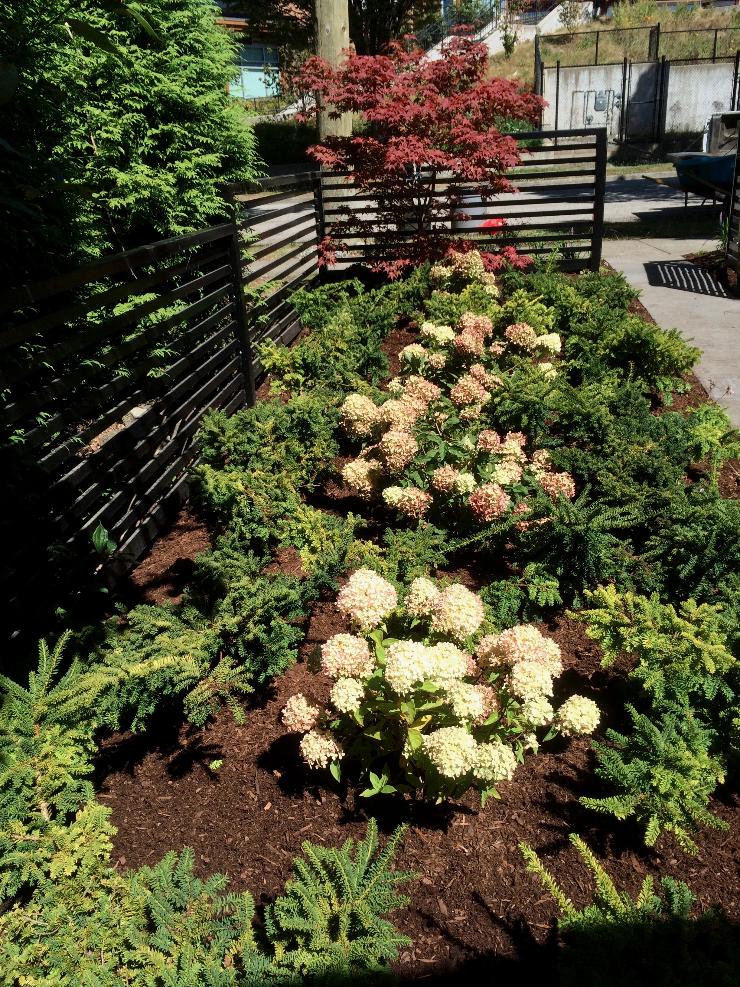 This home was going on the market and the sellers wanted to improve the landscaping, which was currently just lawn with a lone acer palmatum. We chose plants that would be semi-hardy for the non-irrigated garden, made up of a mix of evergreen and deciduous shrubs, and groundcovers.