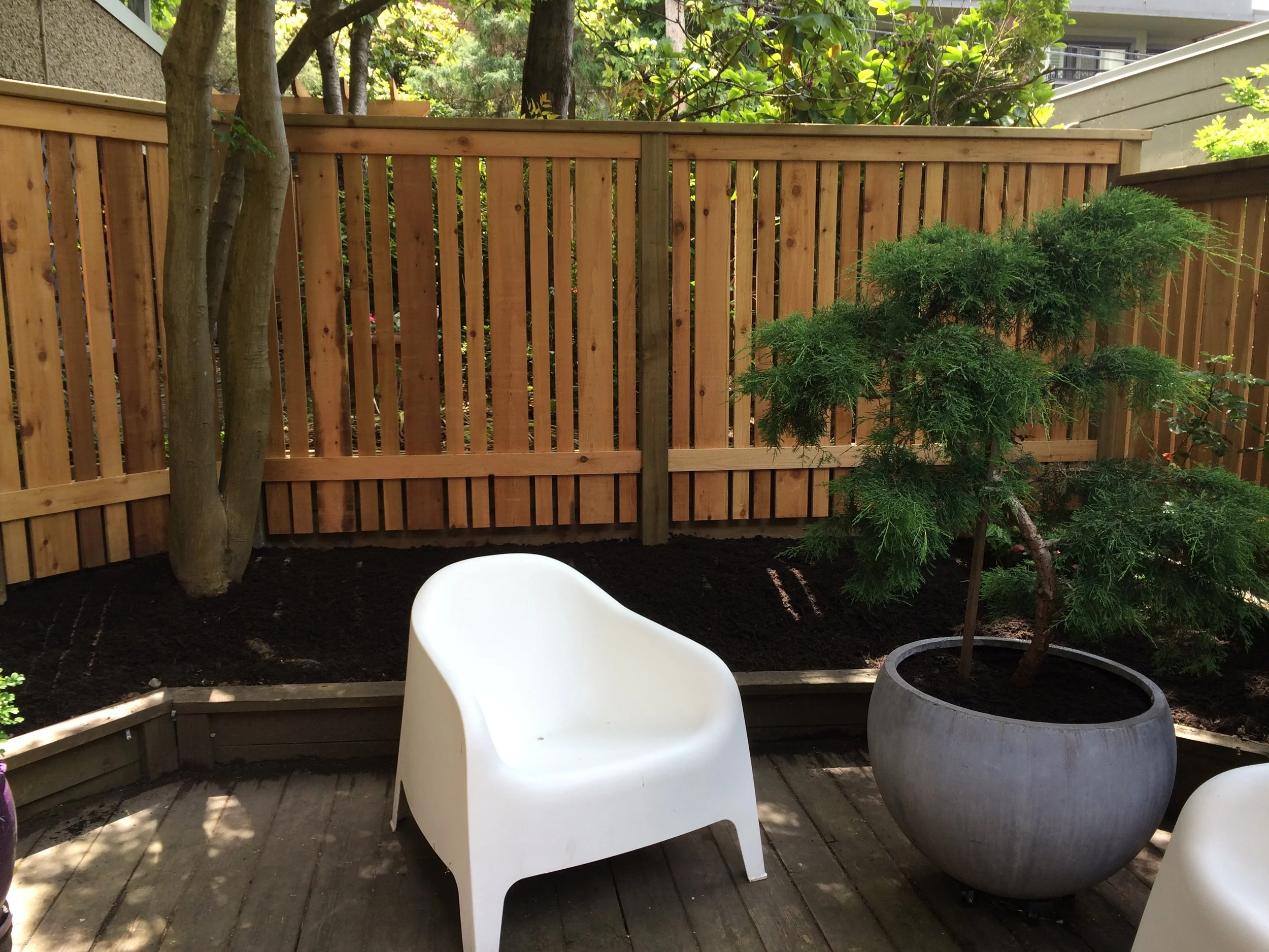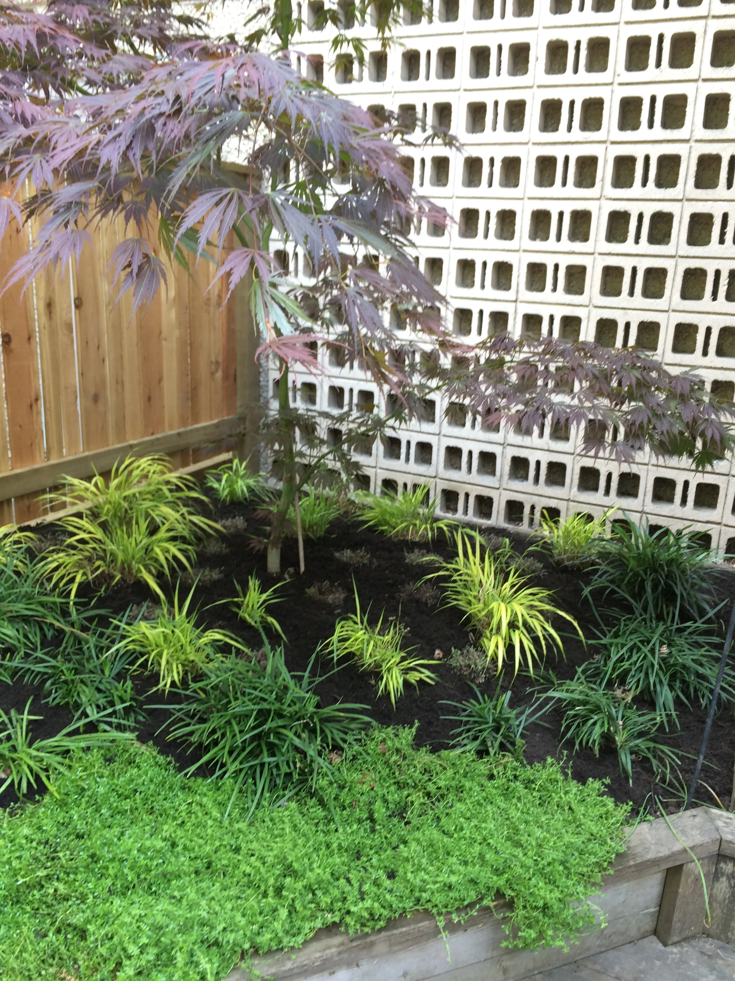 This patio space had existing retaining beds, a mature Japanese maple canopy, and a large skimmia japonica hedge. Working with the resident, we selected an additional Japanese maple, and perennials for underneath, plus two specimen trees for containers. Topped up with black mulch throughout, the plants pop serenely.